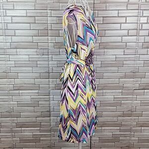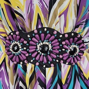 Polyester spandex blend comfortable stretchy fabric in a colorful chevron print. This dress has a plunging v-neckline showing off the ornate built in beaded sash that bow ties in the back. Great pre-owned condition