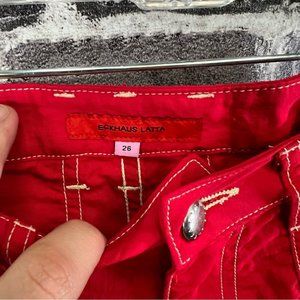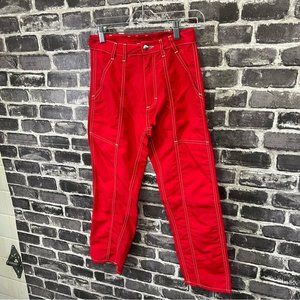 Slim-fit panelled nylon trousers in primary red. Cropped leg. Mid-rise. Four-pocket styling. Zip-fly. Silver-tone hardware. Contrast stitching in off-white.