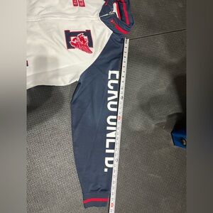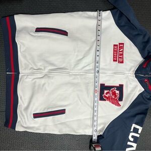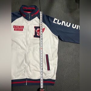 Classic Stylish comfort Ecko Jacket. Mens XL Red White and Blue Full zipper plus zippered hideaway hoodie. Well taken care of, couple unnoticeable light stains on front if you zoom in, but still lookin great to sport.