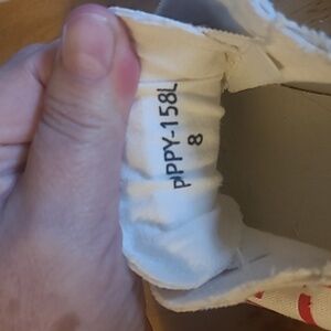 Stylish high-top sneakers with rhinestone embellishments. Unique design with red and green accents. Perfect for a bold look. Size 8