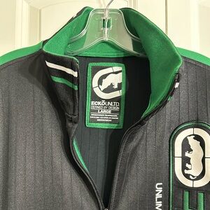 Black and green Ecko Unlimited retro track jacket with prominent logo. Black with striking green details.