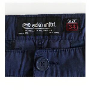 The Ecko Unltd Blue Cargo Shorts in men's size 34 are a stylish and versatile choice. Made from cotton with a dark wash, these solid blue shorts feature a zip closure and cargo pockets for added functionality. The mid-rise fit and flat front design give a trendy and comfortable look, perfect for a variety of occasions r. The brand's logo accents add a touch of flair to the overall style.