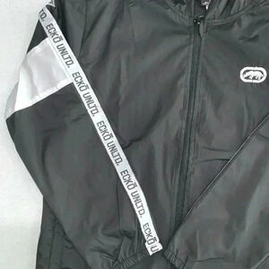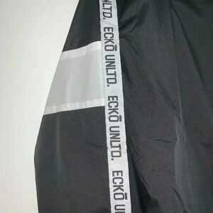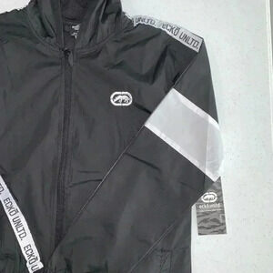 This fashion forward Ecko Unltd windbreaker features two tone, front zipper, graphic detail on front and the printed insets on the sleeve make this windbreaker a must have for your wardrobe.