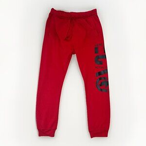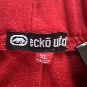 Ecko Unltd. Red jogger sweatpants with black logo. Says “We’re Actual Factual” on side leg. Drawstring and front pockets. One back pocket. Elastic stretch waist. Tiny mark on ankle hard to see. In good condition.