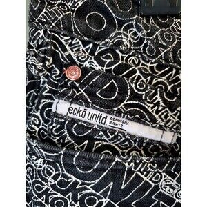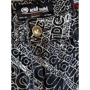 Ecko Unltd Mens Black Baggy Denim Jean Shorts All Over Logo Raw Edge Size 32