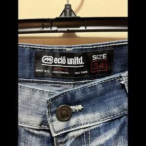 Ecko Unltd Men's Vintage Baggie Fit Wide Leg Jean Shorts in size 34. These Bermuda style shorts are blue in color and designed for regular size men. They feature the Ecko Unltd. brand.