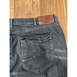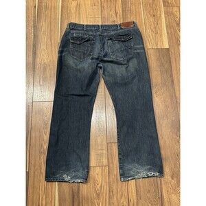 The product is a pair of Mark Ecko Y2K Faded Dark Wash Jeans in size 42x32. These baggy jeans have a relaxed fit and feature a vintage grunge style with whiskered detailing. Made of cotton, they are in a classic blue color and are perfect for those who appreciate the 90s hip hop theme. The bootcut style adds a touch of flair to the overall look, making them a stylish choice for men looking to make a statement with their fashion.