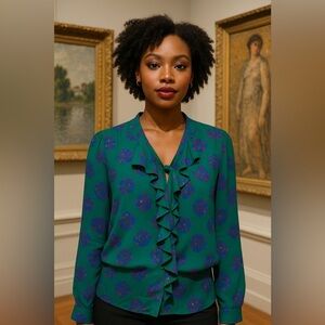 Beautiful and unique ECLAIR blouse featuring a bold multicolor abstract print on a rich emerald green background. Designed with a feminine ruffle front detail and tie-neck accent, this piece adds a touch of sophistication and flair to any wardrobe.