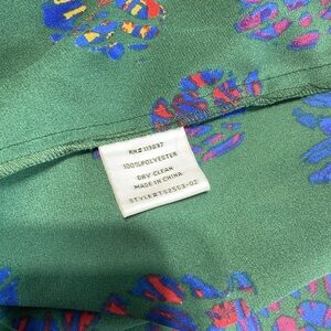 • Color: Emerald green with multicolor abstract print (purple, blue, red, yellow accents)