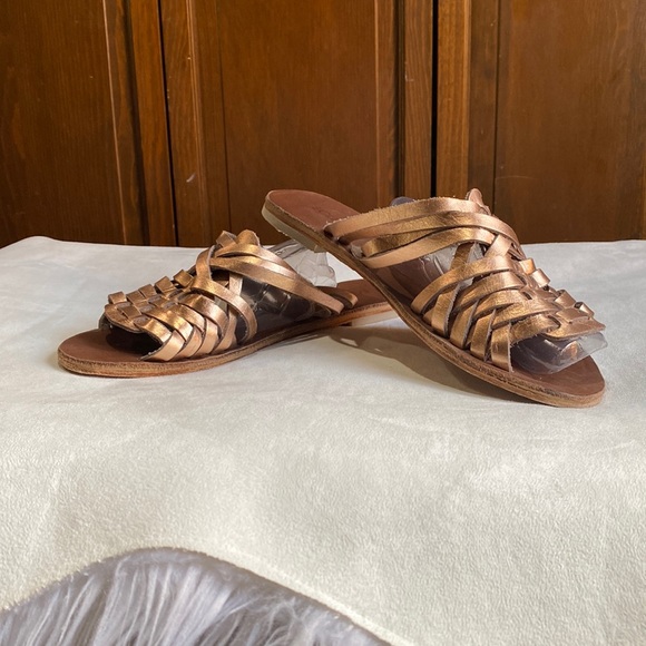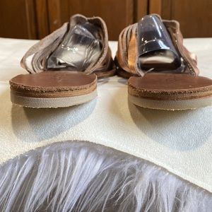 Here is a slip on huarache style sandal by Eclectic Array in the color Pewter. It is all leather and has a leather bottom and is in great shape. Very boho and ready for summer. All offers welcomed.