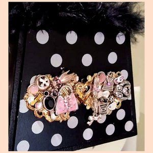 Front panel is covered from left to right with a hodgepodge of girly charms, random parts & pieces of vintage jewelry & glued on upcycled jewels; hearts, pink purse, hand mirror, Born to Shop, beads, bows, pearls & more!