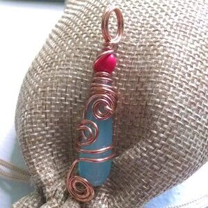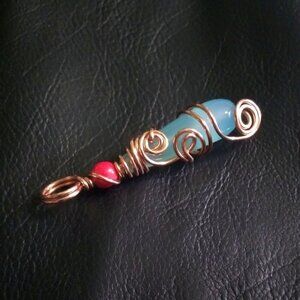 This pendant: features a lovely med/light blue Agate elongated teardrop, topped with a hot pink Howlite bead, and lots of copper jewelry wire wrapped in a free flowing, femininely unpredictable swirlz and curlz design. It has a large bail that can accommodate most chain thicknesses or leather cords that you may already own. This pendant looks great worn close to the throat or in your cleavage as an attention getter...