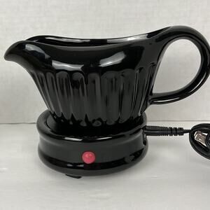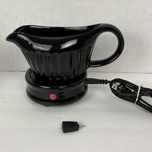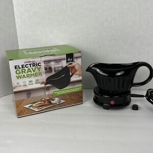 Eco Chef Electric Gravy Warmer. 2 Cup capacity. For Sauce, Gravy or Syrup. Loop Handle, Drip-Less spout, Light Indicator. Ceramic Gravy boat sits on a headed base. Base has a detachable power cord. Boat is microwave safe. Tested fine - base power light works and base heats.