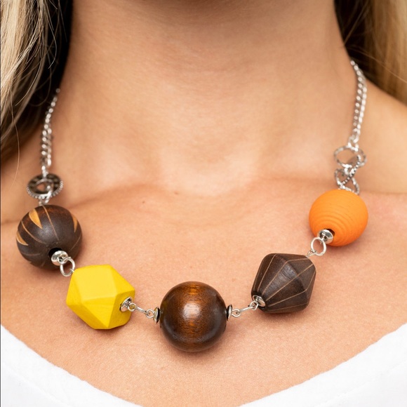 Infused with yellow and orange wooden beads, a mismatched assortment of studded silver hoops, textured silver rings, and oversized brown wooden beads delicately connect across the chest for a stylishly handcrafted fashion. Features an adjustable clasp closure.