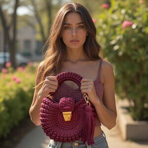 Features: Handcrafted from upcycled T-shirt yarn, this lightweight crossbody is a chic blend of sustainability and style. It has a unique woven pattern, lovely tassels, a gold buckle, and a versatile gold chain strap. Perfect for adding a boho touch to any outfit, whether you're heading to a festival, casual brunch, or a summer outing.
