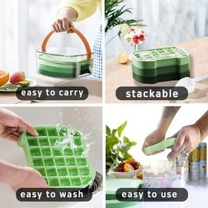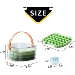 SAVES SPACE : The ice bin for freezer features a space saving design. It measures 7.6 x 7.6 x 4.2 inches, and the stackable ice trays can be stored in it. It is the perfect small ice maker set for you if you have limited space in your freezer. The ice cube bin has handles on both sides for easy portability too.