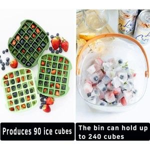 5 IN 1 CONVENIENCE : Comes with 3 small ice cube trays with lids, 1 bin with lid, and 1 scoop. Each tray produces 30 small ice cubes for a total of 90 cubes, and the bin can hold up to 240 cubes.