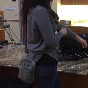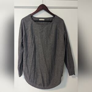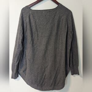 Well worn but still in good shape except for all over pilling (it could probably be removed with a depilling tool, but I never tried). The sleeves are fitted and the body is loose with a curved bottom hem. Super comfy. Size Unknown but I would call it a Large.