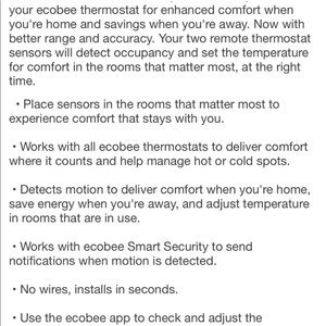 SmartSensor unlocks and amplifies the full power of your ecobee thermostat for enhanced comfort when you're home and savings when you're away. Now with better range and accuracy. Your two remote thermostat sensors will detect occupancy and set the temperature for comfort in the rooms that matter most, at the right time.