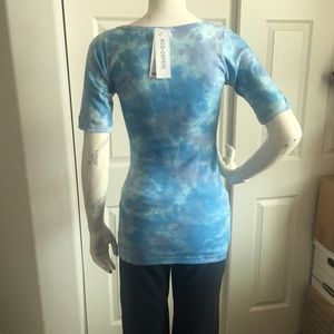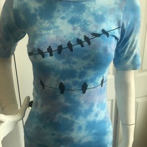 Eco-centric 100% Organic 1x1 rib cotton short sleeve tee. Ballet neck, Hand dyed top w/digital print of birds on a line. Extremely soft and stretchy fabric.