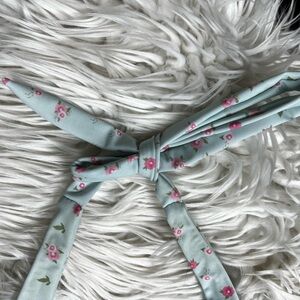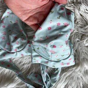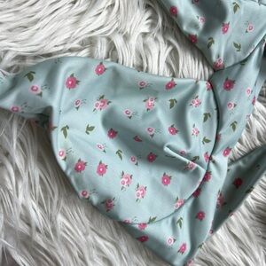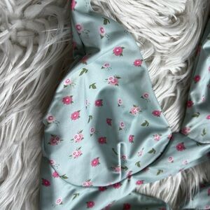 Stay cute and conscious in this Ecohoaka women’s bikini top, size Medium. This light blue halter swim top features an allover ditsy floral print with pink flowers and green leaves. Designed for comfort and style with long adjustable ties at the neck and back for a secure, customizable fit. Light padding is built in for support and shape.