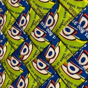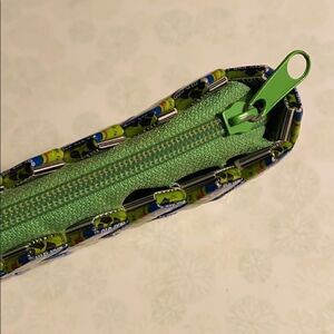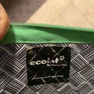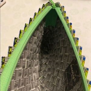 Cool “baguette” style recycled wrapper and label clutch by Ecoist. Outside features green in keeping with its green origins, and insides are woven of black and white zebra-like bar codes. Quite sturdy. A unique fashion find. Great gift for the environmentally conscious.