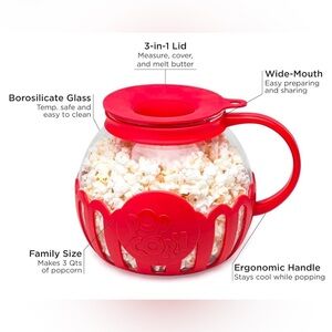 NWT Ecolution Patented Micro-Pop Microwave Popcorn Popper with Temperature Safe Glass, 3-in-1 Lid Measures Kernels and Melts Butter, Made Without BPA, Dishwasher Safe, 3-Quart, Red