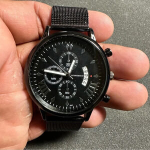 Economicxi mens quartz fashion watch black case strap and dial date just working with new battery shows signs of wear such as scratches on case band and crystal see pictures for reference