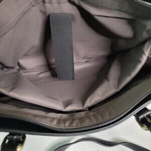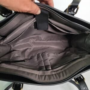 This is a sleek, black Ecosusi bag, likely a tote or a work bag, designed with a professional and versatile aesthetic. This is a classic black color, suggesting a versatile and timeless appeal, made from a material that appears to be faux leather or a similar synthetic. It has two sturdy top handles with adjustable buckles in a gold-tone finish, adding a touch of elegance. A prominent zippered pocket is visible on the back, offering convenient access and secure storage for essentials. The zipper pull and a small metallic logo tag also feature a gold-tone finish, complementing the buckles. The bag's structured shape and clean lines suggest it is well-suited for professional settings, carrying documents, or as a stylish everyday accessory.