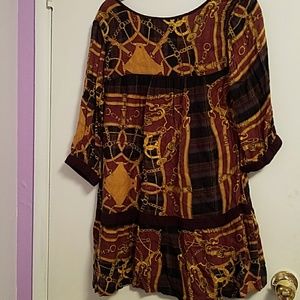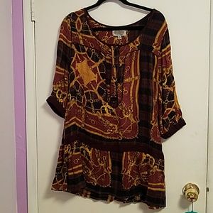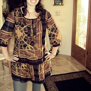 Burgandy, gold, brown, and dark navy blue with a chain design, 3/4 sleeve dress from Urban Outfitters that would look perfect with black patterned tights and boots!
