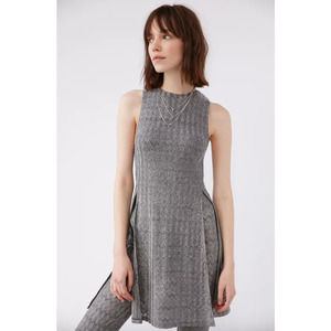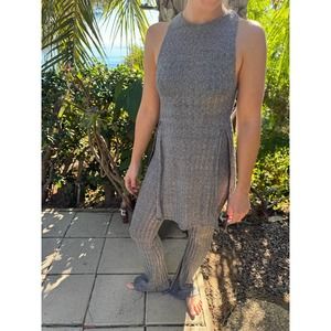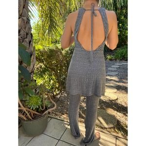 Girl don't got time for two pieces- that's why we need this retro pull-on double layer jumpsuit from Ecote. In a stretchy, textured flame-stitch knit featuring skin-tight, high-rise flares layered under a sleeveless, side-split tunic. Finished with a plunging scoop-back topped with a tie.