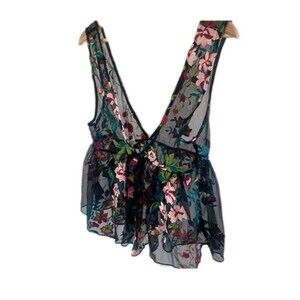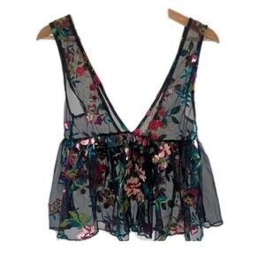 The Ecote Black Sheer Embroidered Floral Tank Top in XS is a stylish and versatile piece perfect for casual or travel occasions. This bohemian-inspired top features a V-neckline, pullover closure, and wide straps, making it comfortable and easy to wear. The sheer black mesh fabric with embroidered floral accents adds a touch of feminine charm, while the cropped style is ideal for layering during various seasons. Perfect for fans of indie, cottagecore, and boho aesthetics, this tank is a must-have for those looking to add a trendy yet effortless piece to their wardrobe.