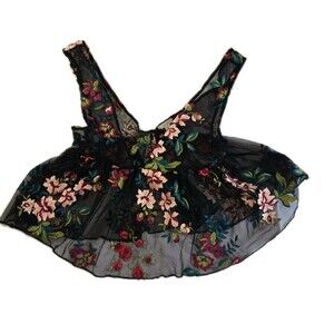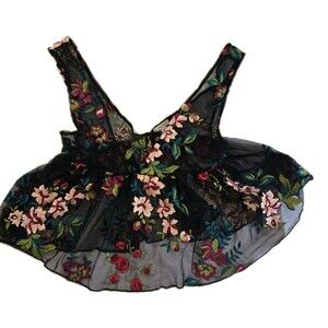 The Ecote Black Sheer Embroidered Floral Tank Top in XS is a stylish and versatile piece perfect for casual or travel occasions. This bohemian-inspired top features a V-neckline, pullover closure, and wide straps, making it comfortable and easy to wear. The sheer black mesh fabric with embroidered floral accents adds a touch of feminine charm, while the cropped style is ideal for layering during various seasons. Perfect for fans of indie, cottagecore, and boho aesthetics, this tank is a must-have for those looking to add a trendy yet effortless piece to their wardrobe.