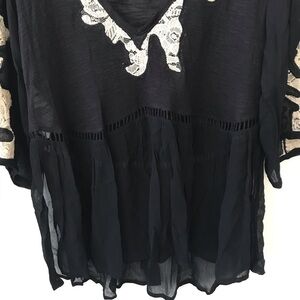 Black blouse with lace knit detail, deep v on back, tie at upper back and flowy, cropped sleeves. Preowned but in good condition. Sheer / see through