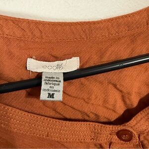 This stylish blouse from Ecote showcases a warm cinnamon brown hue with a relaxed fit and charming ruffled details. The 3/4 sleeves and lightweight fabric make it perfect for a casual yet chic look.