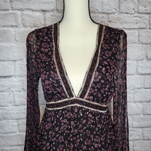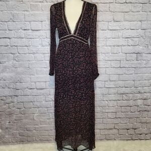 Ecote Dress Black Sheer Maroon Floral Print Split Long Sleeve V Neck Maxi Size S