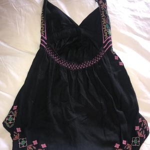 Fun romper with beautiful embroidery detail. Style is halter top with open back and flowy shorts. Very flattering!