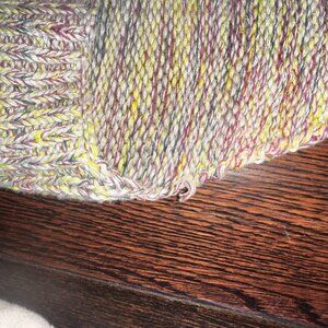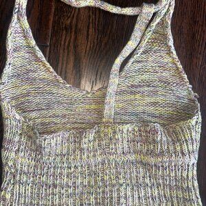 This adorable hand-knit racerback crop top is perfect for summer, festivals, or layering year-round. Features a soft, multicolor yarn blend in muted tones of yellow, lavender, and cream. The ribbed knit design adds a comfy, flattering fit.