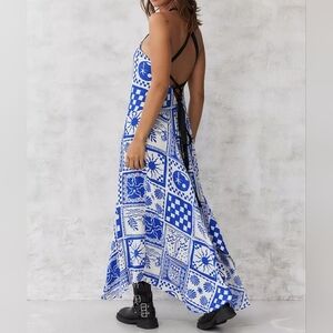 Ecote Janet Strappy-Back Flowy Bohemian Asymmetrical Midi Dress, Blue & White Motif