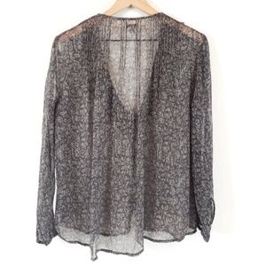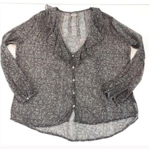 Ecote Long Sleeve Sheer Blouse Ruffle Neck Gray Top Button Down Work