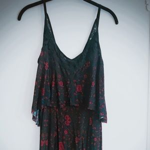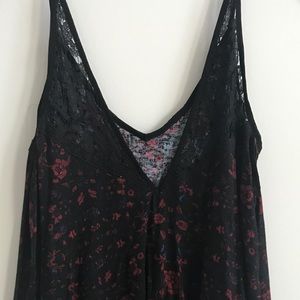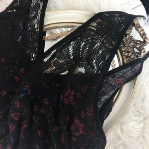 Soft, feminine, and romantic but with a grunge goth vibe mixed in. Layers of raw edges, spaghetti strap front w a thicker strap black lace V shaped back. Lace detail in front at bust. Deep floral burgundy patterns with black and tiny hints of navy blue.
