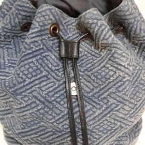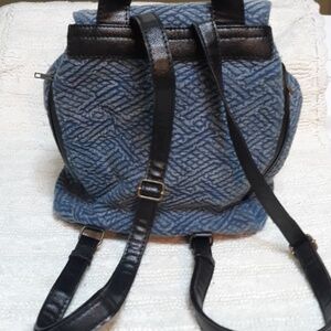 In a real two-tone blue with a nice design sewn into it. From Urban wear. Has black strapping and a pulley in front with snap on lid for extra closer. The side zippers are not pockets but go right into backpack for easy access to grab something. In great condition . Approximately 14x12 size
