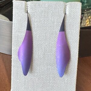 Gorgeous lightweight purple metal earrings with a subtle sheen, creating a beautiful shimmer effect. These earrings feature a darker gray-toned top that blends into a rich, shimmery purple body. Designed with hook backings, they’re easy to wear and comfortable thanks to their lightweight metal construction.