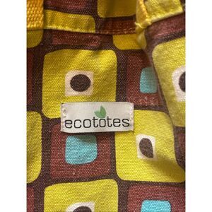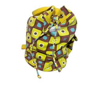 Canvas bucket-style backpack with drawstring closure. Geometric square pattern in yellow, brown, and blue tones. Dual top handles with adjustable shoulder straps. Exterior flap pocket on the side. Metal grommets at the drawstring opening. Fabric interior. Approximate height shown just under 18 inches based on photos, width about 15 inches. Lightweight and flexible construction. Branded Ecototes.