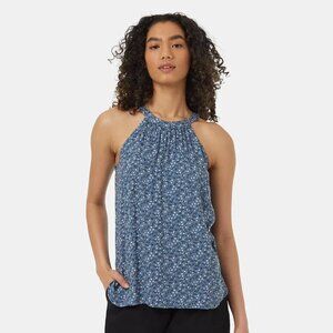 Tentree Ecowoven Crepe Cypress Tank from Tentree. XS small, Floral print in Canyon Blue. Halter neckline with back keyhole and swoop hemline. Made of Lenzing Viscose. I really love the print and how this material feels. It's lovely!