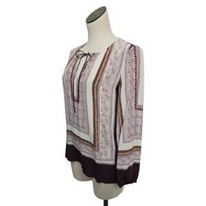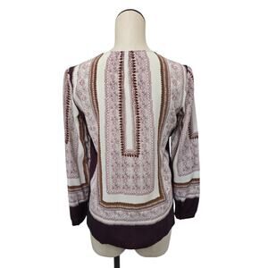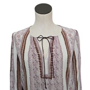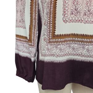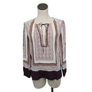 Ecru 100% Silk Cream Maroon Paisley Floral Long Sleeve Keyhole Blouse Size Small