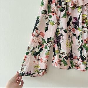 In good preowned condition. Off-the-shoulder blouse. Ruffle detail. Colorful floral print. Silk.