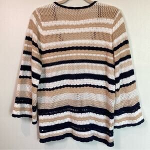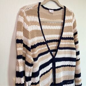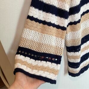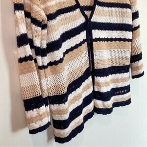 -lightweight navy blue, tan, and white striped cardigan in allover textured crochet knit