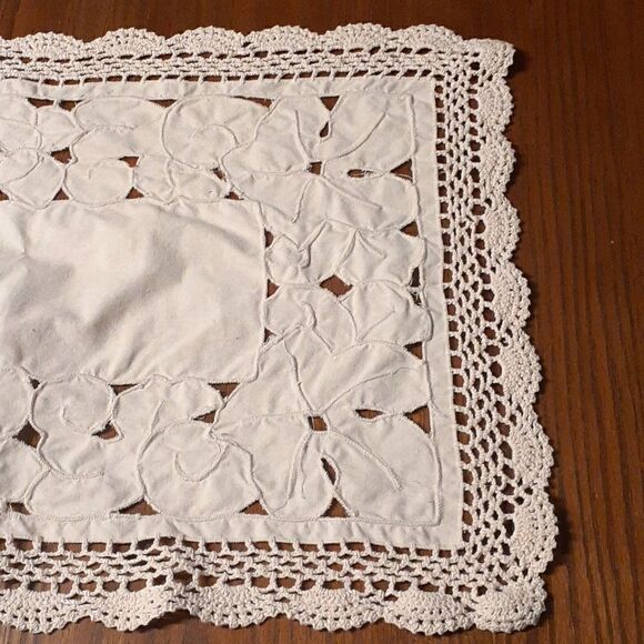 Ecru linen w/stitched design ecru crocheted edging & mat
