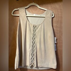 Ecru shell. Tan, suede, size large. Mock lace up front. Bought second hand but never wore it. Selling just to get it out of my closet. Like new, tags still on it.